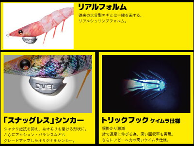 従来のエギ形状では出せないデュエルならではの釣れる波動はそのままに、引き抵抗を軽減することに成功した新採用のボディです。